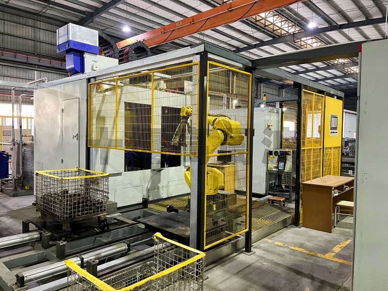 工作方式:機(jī)器人通過(guò)3D視覺(jué)無(wú)序在料框內(nèi)抓料,自動(dòng)上料至淬火機(jī)床,淬火后自動(dòng)下料至下料框。